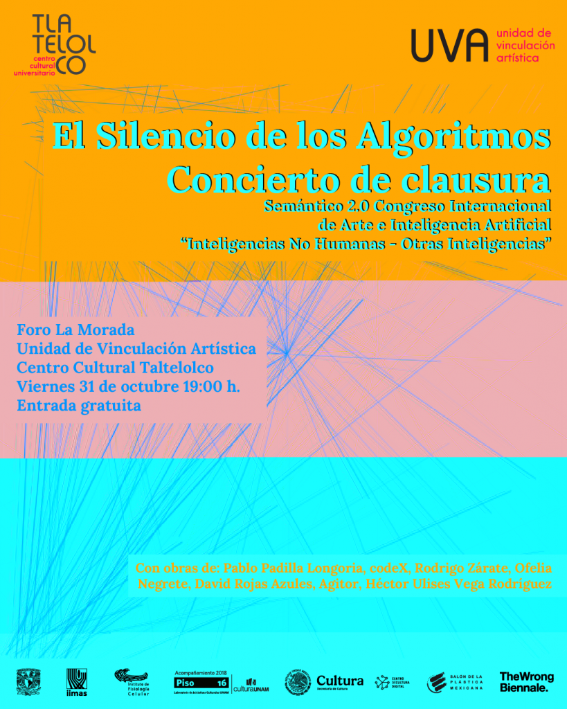 | 18:00 | KEY NOTE Laboratorio del Conocimiento-ACT: Ximena González, Jesus Ramírez, Eugenio Tisselli y Octavio Moctezuma | Neurociencias y estética en la Inteligencia Artificial |